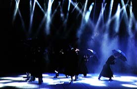 この舞台は、二つの世界を移動する。 ひとつは、いじめにさらされている、中学生の世界。 もうひとつは、崩壊にさらされている、ある家族の世界。 二つの世界を、行きつ戻りつしながら、物語は進められていく。 登場人物たちは、世界の移動と共に、 中学生と、家族の構成員という二つの役割を演じる。 明かりが落ちる。 風の音。 雨の音。 傘をさして、黒いレインコートの人々が足早に行き過ぎる。 一人の男が立ち止まり、傘をたたむ。 ドアを開けるアクション・・・。 ![]() |