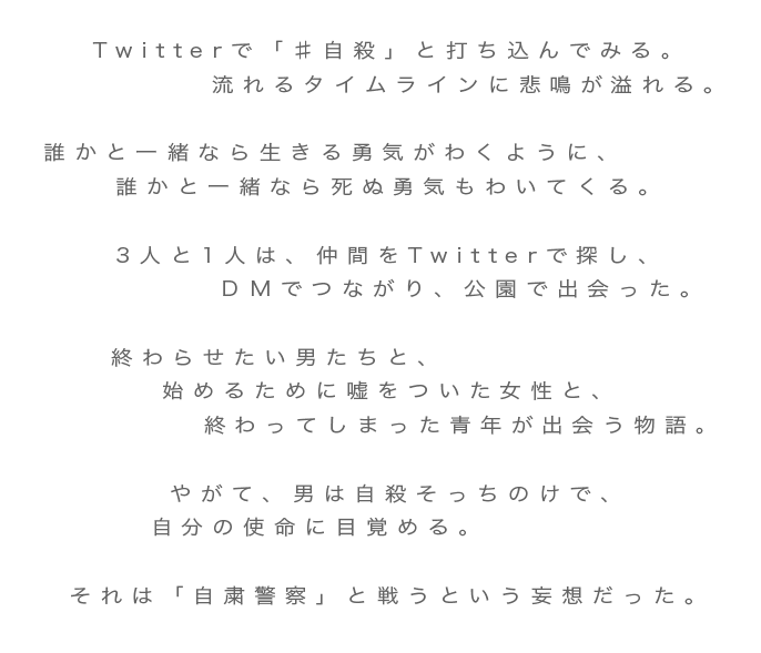 「ハルシオン・デイズ2020」を上演することに、本当にいろんな思いがこみ上げています。初演は、自殺系サイトで出会った4人の物語でした。2020では、ツイッターの♯(ハッシュタグ)自殺で、出会った4人の物語です。初演はその中の一人が「人間の盾」になりますが、2020では、目に見えない「自粛警察」に戦いを挑みます。素敵なキャストが集まってくれました。優しさとたくましさが両立する柿澤勇人さん、僕とは二回目、知性と実力が光る南沢奈央さん、チャレンジ精神と野望に溢れた須藤蓮さん、色気と安定のベテラン石井一孝さん。間違いなく、刺激的で面白い作品になると思います。劇場でお会いできることを祈っています。