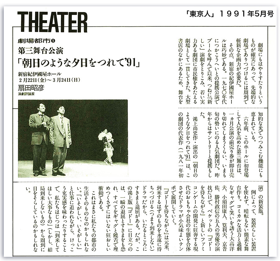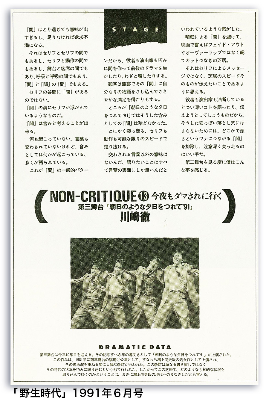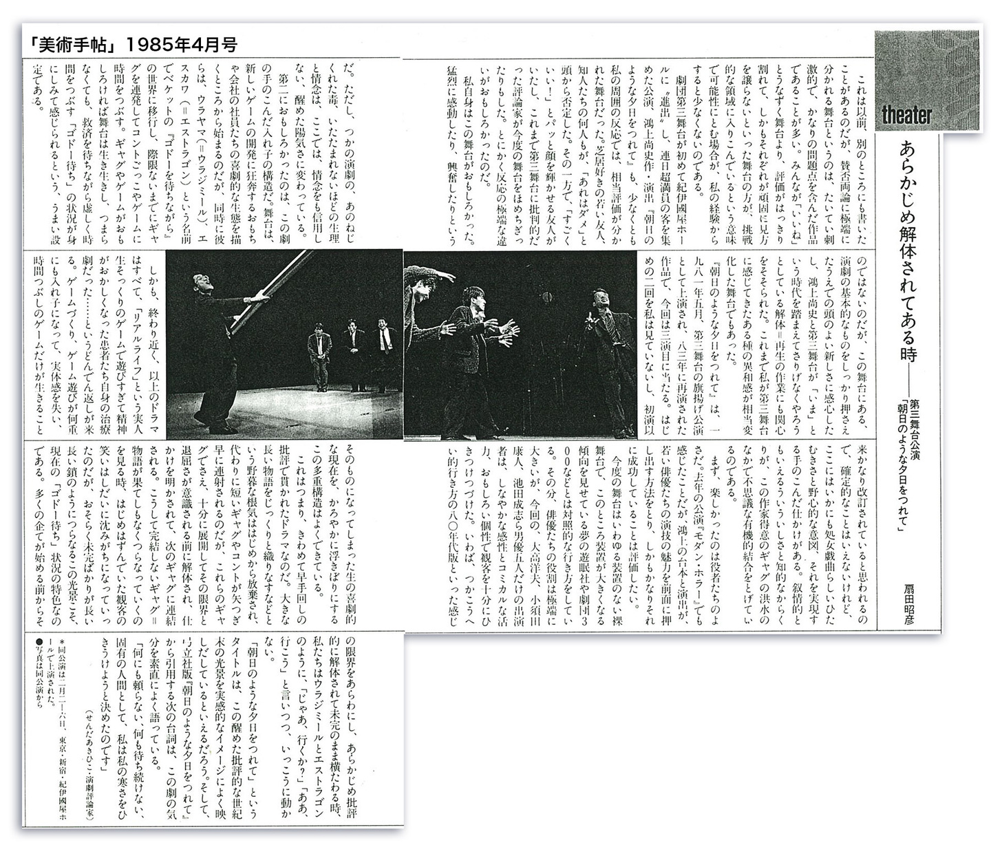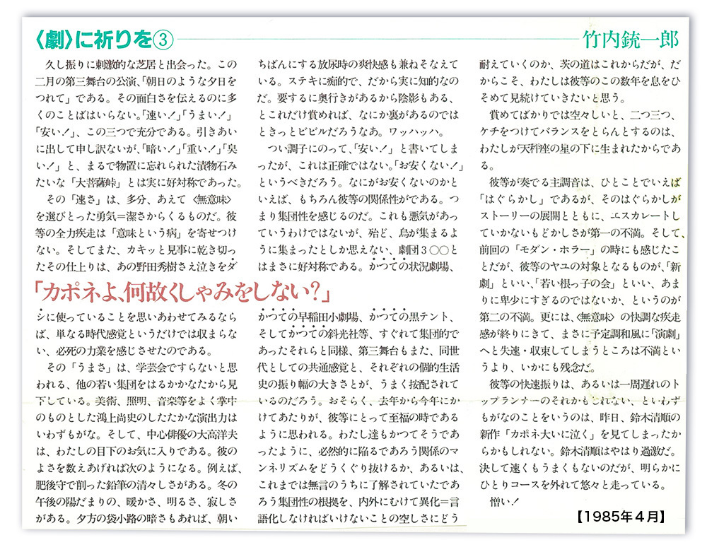 「美術手帖」1985年4月号 「現代詩手帖」より 1985年4月(「カポネよ、何故くしゃみをしない?」竹内銃一郎氏) 「國文學」1985年4月号 「産経新聞」朝刊1991年2月3日掲載 「スポーツニッポン」1991年2月4日掲載 「野生時代」1991年6月号 「東京人」1991年5月号 「読売新聞」夕刊1991年2月23日掲載 「日経新聞」1991年3月1日掲載 「愛媛新聞」1991年3月24日掲載